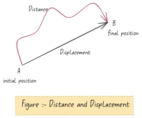 - Distance is the total path length travelled by the moving object.